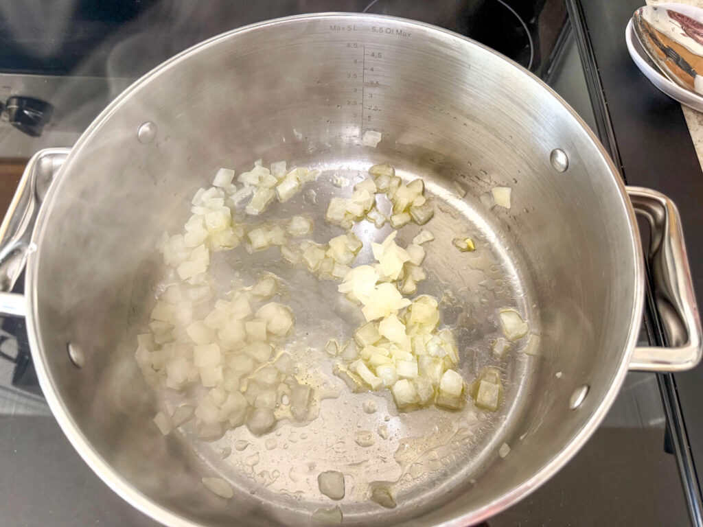 - Put 2 tbsp. olive oil in a large pot and turn on medium heat. Sauté onions until translucent.