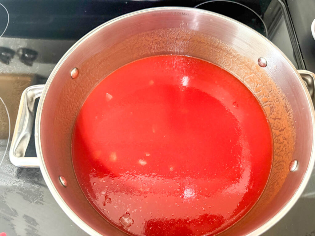 Once onions are translucent, add 46 ounces of tomato juice to the soup pot.