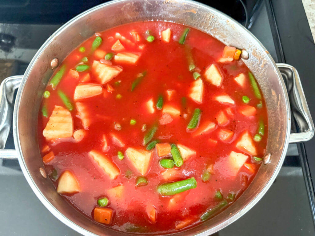 To make this easy amish beef vegetable soup recipe, I like to buy a freezer bag of mixed veggies – carrots and green peas. I will add the entire bag to the pot of soup along with frozen green beans. You could also use fresh vegetables or canned.